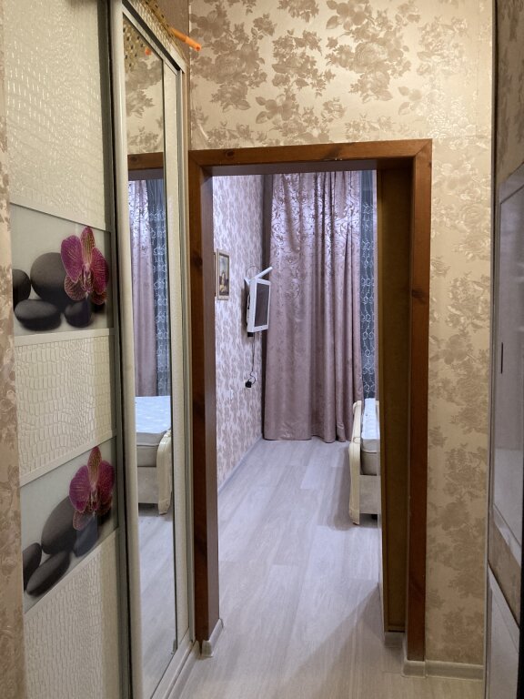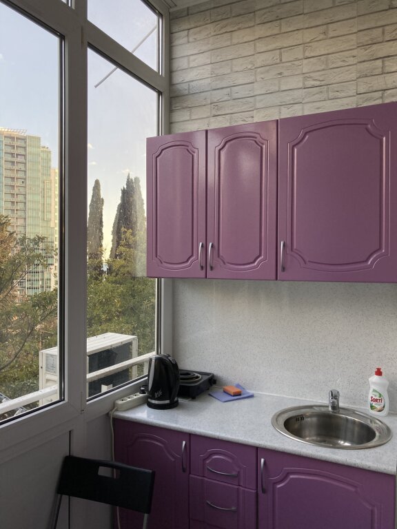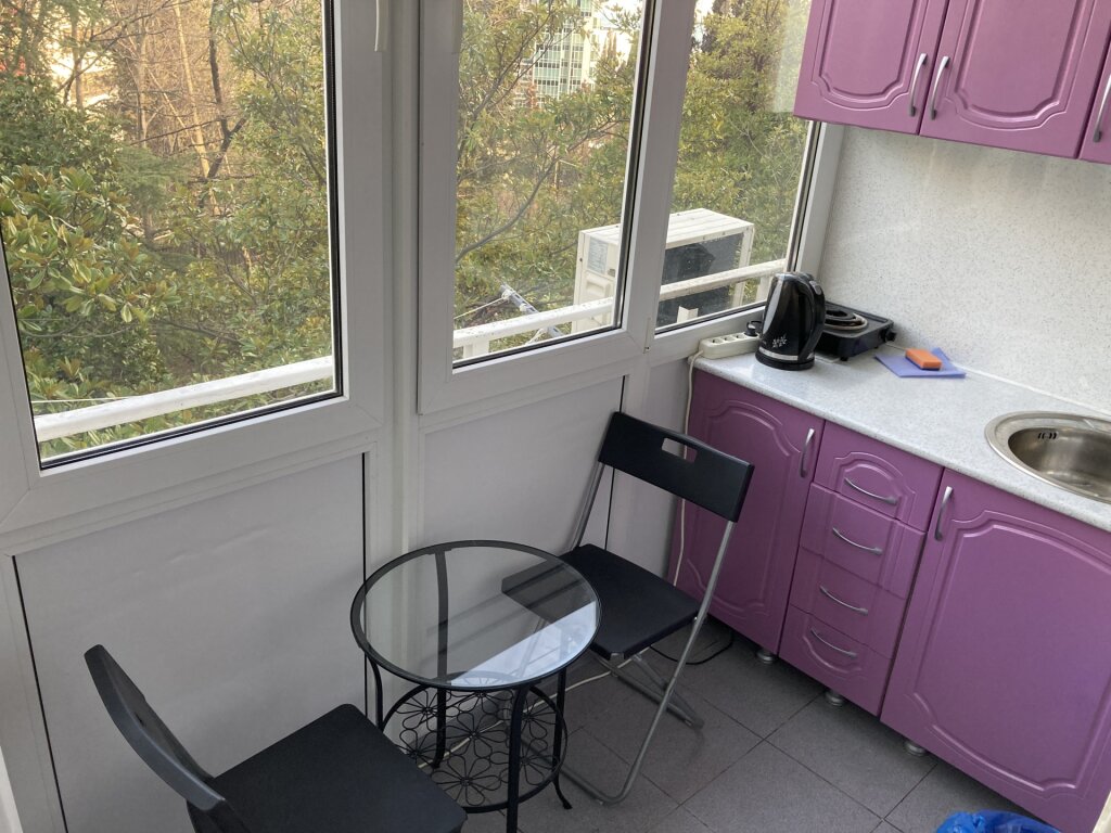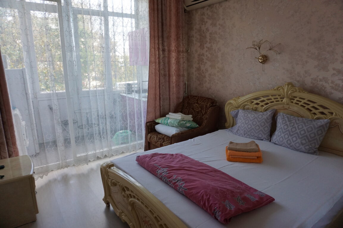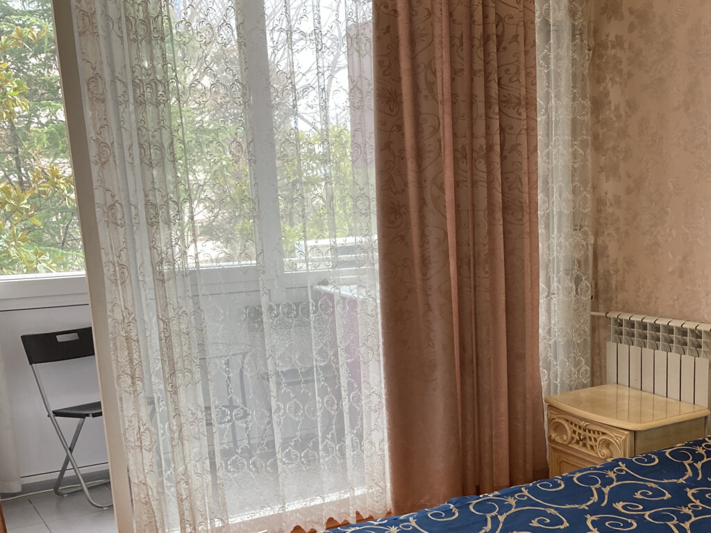 Номер с 2 кроватями : 2 спальная+кресло-кровать или 1 спальная кровать . В коридоре - встроенный шкаф. Балкон застеклен , на нем расположена кухня. Окна балкона полностью открываются. Вид на магнолиевый сад. Море видно за деревьями.